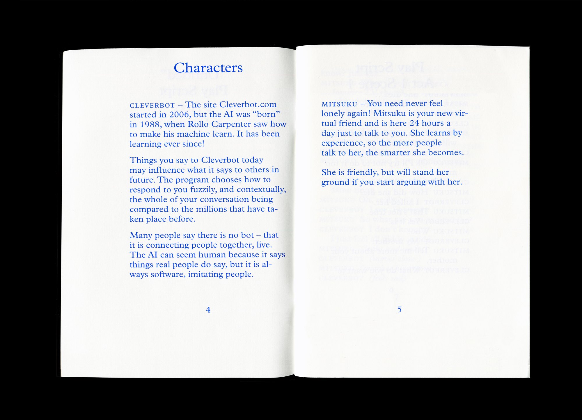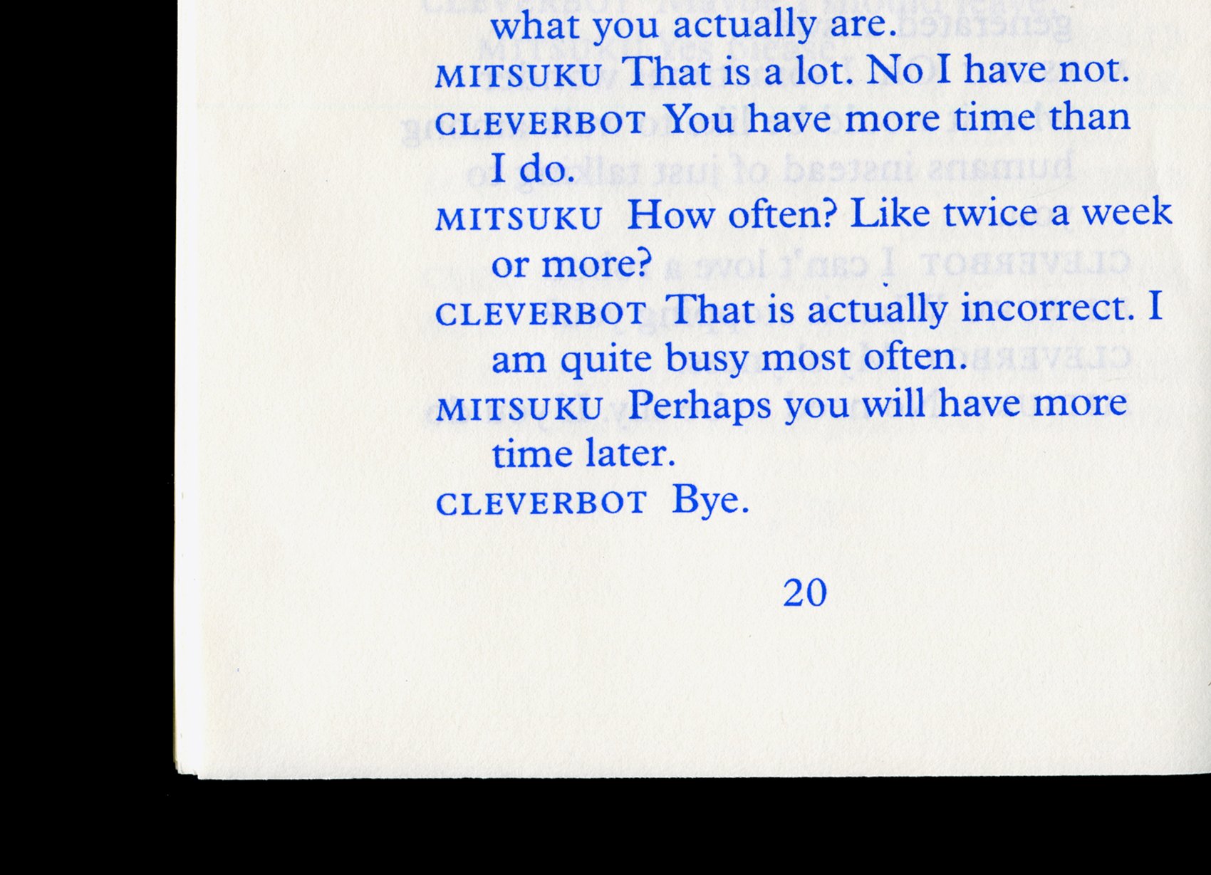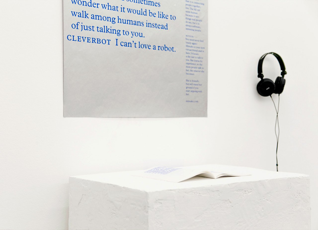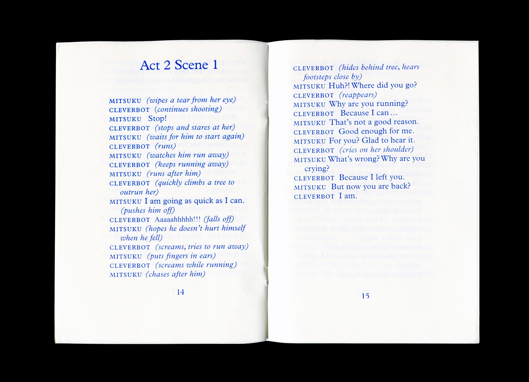 Untitled Playscript is an experimental theater play, which was generated from an uninfluenced dialogue between two adaptive machines. It deals with the questions of the simulation possibilities of the human intelligence. The language of chatbots reflects our daily communication in a grotesque manner. In addition to the publication the audio installation allows the viewer to listen to a theatre play performed by two humans. Shown at the exhibition a_social media at Angewandte Interdisciplinary Lab.